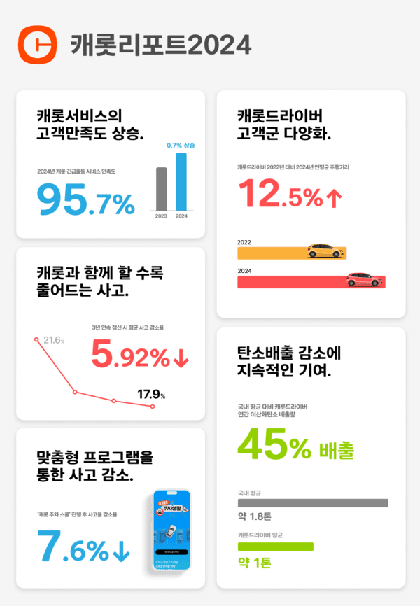 캐롯의 데이터 기반 안전 주행 프로그램은 사고율 감소에 기여하고 있다. 보험 갱신 1회차마다 평균 사고율이 5.92% 감소했으며, '주차 스쿨' 프로그램 참여 고객의 사고율은 7.6% 감소하는 효과를 보였다. 2024년 기준 긴급 출동 서비스 고객 만족도 역시 95.7%를 기록하며 높은 고객 만족도를 제공하고 있다.
