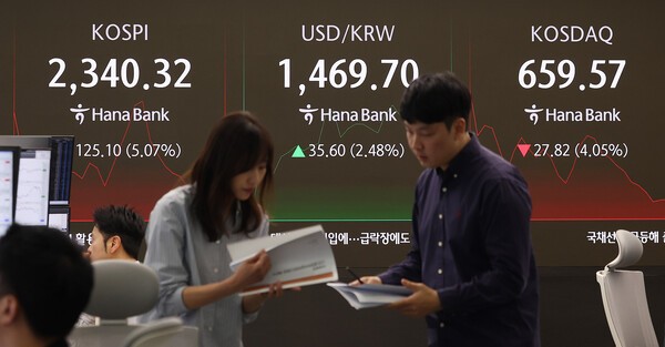 이날 코스피는 전 거래일(2465.42)보다 106.17포인트( 4.31%) 하락한 2359.25로 출발했다. 코스닥지수도 전 거래일(687.39)보다 20.37포인트(2.96%) 내린 667.02에 거래를 시작했다.