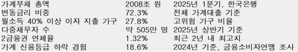 이처럼 이자만 간신히 갚는 ‘생존형 대출 가계’가 대한민국 전역에서 빠르게 확산되고 있다. 변동금리 대출의 높은 비중, 실질소득의 정체, 생활비 상승, 자산 가치 하락 등 여러 악재가 복합적으로 작용하며, 수많은 가계가 더는 원금은 꿈도 꾸지 못하는 구조로 내몰리고 있는 것이다.
